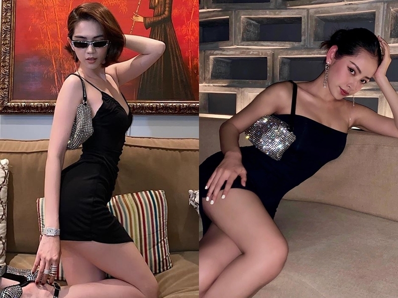Cùng chọn mẫu váy đen ôm body, phối túi hiệu đính đá 20 triệu, cặp sao như chị em sinh đôi trong shoot hình này. (Ảnh: T.H)