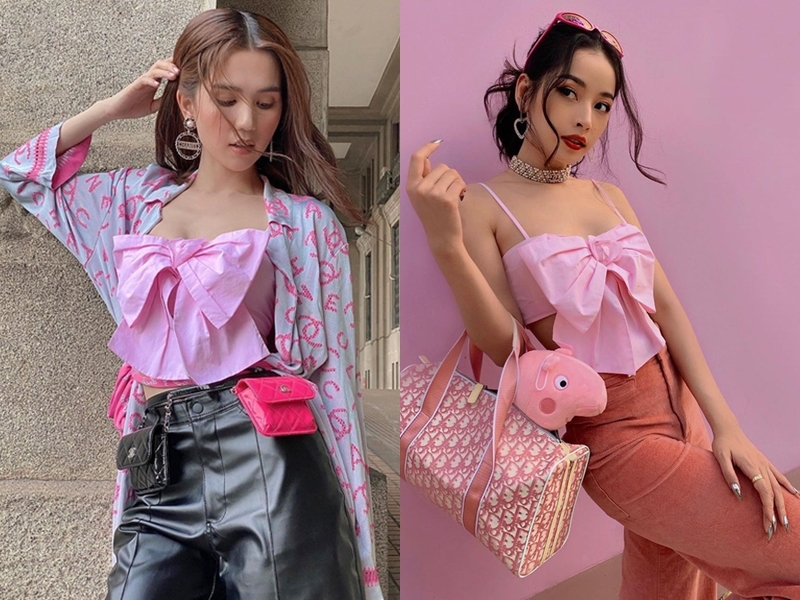 Ngay cả mẫu túi tí hon Jacquemus đình đám 2019 cũng nằm trong BST của các "yêu nữ hàng hiệu", Chi Pu phối với bộ cánh hồng trong khi Ngọc Trinh chọn gam vàng nổi bật. (Ảnh: T.H)