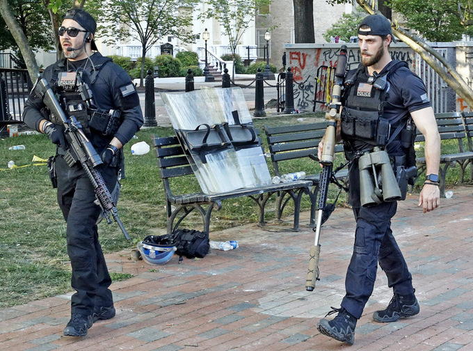 Mật vụ Mỹ mang súng SR-25 (trái) và AXAICS hộ tống Trump tại Công viên Lafayette hôm 1/6. Ảnh: AP.