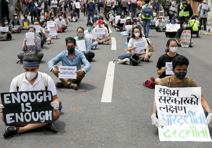 Người biểu tình bên ngoài Dinh Thủ tướng ở Kathmandu, Nepal, yêu cầu chính phủ phản ứng tốt hơn nữa với Covid-19 ngày 9/6. Ảnh: Reuters.