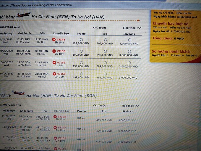 Chúng tôi vào trang web chính thức của các hãng để săn vé cho chặng bay khởi hành từ TP HCM. Tuy nhiên, với giá vé 8.000 đồng (hạng vé Promo) của hãng Vietjet Air đã không còn vé nào, dù mới tung ra một ngày và còn một ngày nữa mới hết chương trình.