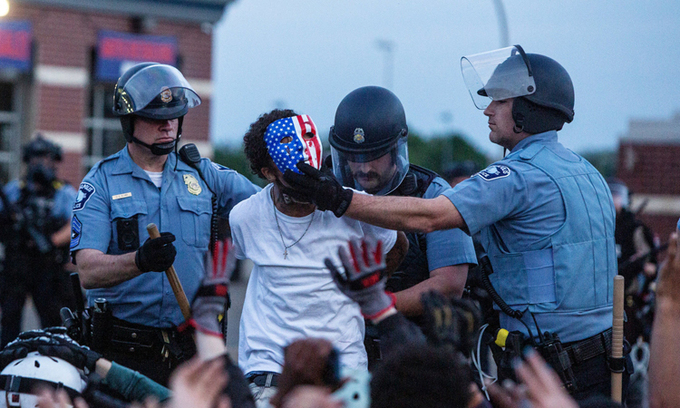 Cảnh sát bắt một người biểu tình ở thành phố Minneapolis, bang Minnesota, hôm 31/5. Ảnh:NYTimes.