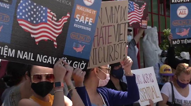 Ngày 8.6 vừa qua, chủ và thợ nail ở California biểu tình yêu cầu Thống đốc Newsom cho mở cửa. Ảnh: Trương Đông Thức