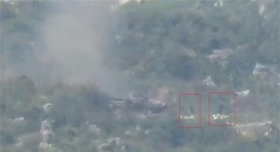 Nhưng điều đáng ngạc nhiên, khi khói tan, có thể thấy được kíp lái đã nhanh chóng lao ra khỏi xe tăng (bên trong khung màu đỏ), rõ ràng là toàn bộ kíp lái còn sống sót.