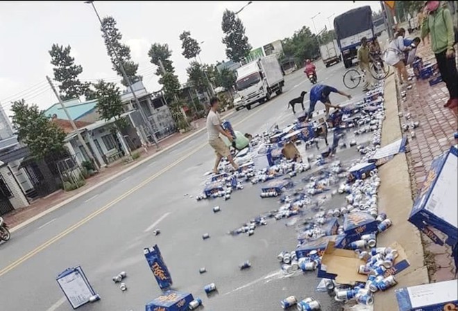 Theo lời kể của người dân, vụ việc xảy ra vào trưa ngày 15.6 trên đường Trần Ngọc Lên (P.Phú Mỹ, TP.Thủ Dầu Một, Bình Dương) khi chiếc xe tải chở bia trong lúc ôm cua từ đường Huỳnh Văn Lũy vào đường Trần Ngọc Lên chỗ đoạn đường dốc nên xe bị nghiêng. Hàng trăm thùng bia đổ ra đường.