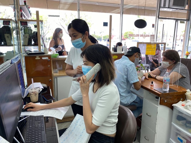 Chị Thủy Danh, chủ tiệm nail ở TP.Gardena (hạt Los Angeles), liên tục nhận cuộc gọi từ khách đặt hẹn. Ảnh: Trương Đông Thức