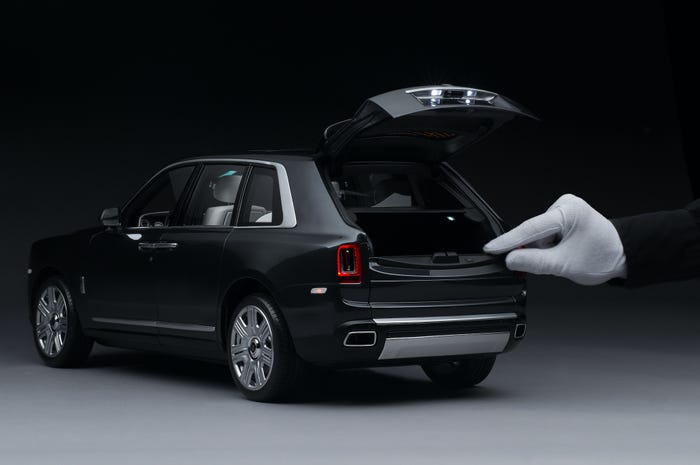 Rolls Royce Cullinan thu nhỏ có sẵn 40.000 màu khác nhau, dài 26 cm, rộng 10 cm và cao 9 cm, và được đựng trong một hộp trưng bày dài một mét với chân đế màu đen bóng sang trọng.