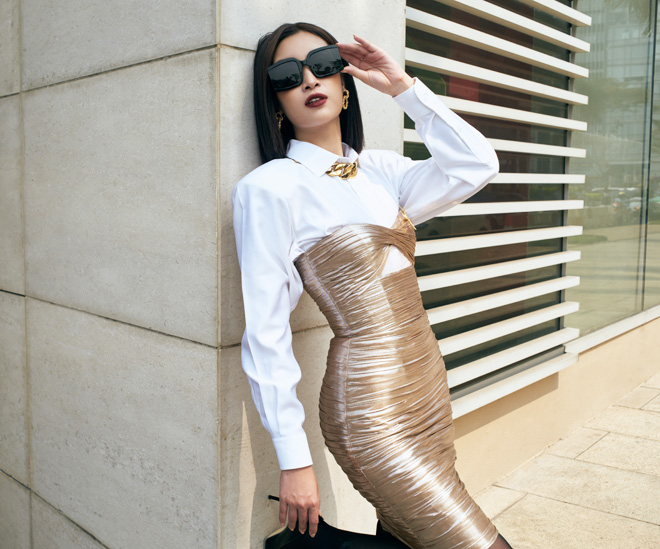 Hình ảnh Đỗ Mỹ Linh cá tính với mốt váy ngoài sơ mi, vest không nội y đầu năm 2020.