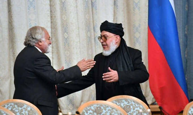 Đại diện phiến quân Taliban Mohammad Abbas Stanikzai (phải) chào đón một người tới tham gia buổi khai mạc đàm phán với phe đối lập Afghanistan tại Moskva, Nga, hồi tháng 2/2019. Ảnh: AFP.