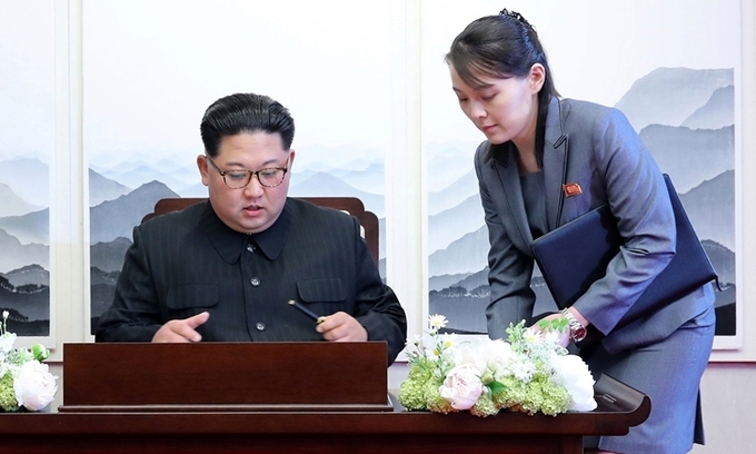 Lănh đạo Triều Tiên Kim Jong-un và em gái Kim Yo-jong tại Khu Phi quân sự liên Triều tháng 4/2018. Ảnh: Reuters.
