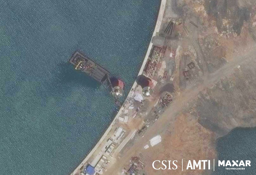 Một trạm E nổi đang được đưa xuống biển vào tháng 4/2018. Ảnh: CSIS/AMTI/MAXAR.
