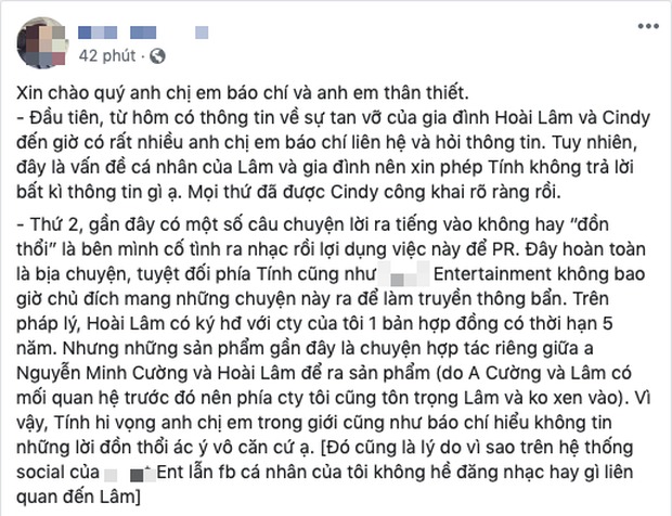 Quản lý Hoài Lâm cho biết thêm: "Bản thân tôi vẫn thương Lâm và Cindy như 2 em của tôi. Chuyện riêng gia đình của 2 bạn, người ngoài không nên phân định đúng sai lỗi do ai. Nếu mọi người yêu thương Hoài Lâm thì cũng hãy tôn trọng cuộc sống riêng của 2 em ấy".