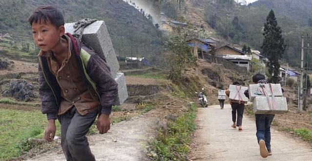 Ảnh: hồi tháng 4-2020, hình ảnh Cậu bé Hà Giang 12 tuổi cõng gạch cay kiếm 18.000 đồng/ngày đã khiến cộng đồng mạng sửng sốt. Tuy nhiên đây chỉ là một trong số nhiều trường hợp trẻ em miền núi phải vật lộn mưu sinh khi đang tuổi cắp sách đến trường. Có thể thấy trong bức ảnh, một cậu bé nhỏ người đang oằn mình cõng 3 viên gạch cay lên bản với giá 2.000 đồng/viên gạch nặng khoảng 12 kg. Theo người đăng tải thì quãng đường lên bản khá xa và dốc ngược, xe máy không lên được nên đều phải dùng sức người; Mỗi ngày cậu bé cõng được 3 chuyến, đồng nghĩa với việc kiếm được 18.000 đồng và đây là một số tiền khá lớn đối với cậu và gia đình.