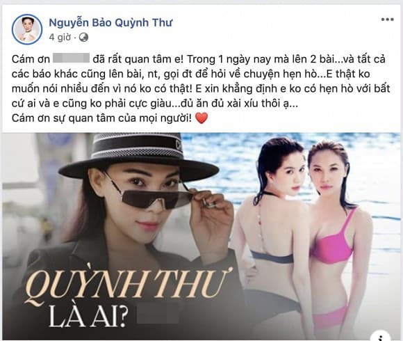 Về phía Quỳnh Thư, cô cũng chính thức lên tiếng về tin đồn. Cô khẳng định bản thân chưa yêu đương gì trong khoảng thời gian này: "Cám ơn đã rất quan tâm em. Trong một ngày nay mà lên 2 bài... và tất cả các báo khác cũng lên bài, nhắn tin, gọi điện thoại để hỏi về chuyện hẹn hò. Em thật không muốn nói nhiều đến vì nó không có thật. Em xin khẳng định, em không có hẹn hò với bất cứ ai và em cũng không phải cực giàu... đủ ăn đủ xài xíu thôi ạ. Cám ơn sự quan tâm của mọi người!".