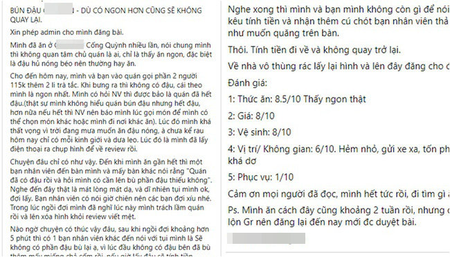 Người này cho biết: "Mình và bạn vào quán gọi phần hai người 115.000 đồng, thêm hai ly trà tắc. Khi bưng ra thì không có đậu, cái theo mình là ngon nhất. Mình có hỏi nhân viên thì được bảo là quán đã hết đậu (thật sự mình không hiểu quán bún đậu nhưng hết đậu, hơn nữa nếu hết thì nhân viên nên báo mình lúc gọi món để mình có thể chọn món khác hoặc mình đi nơi khác ăn). Chưa kể, rau hôm nay chỉ có mỗi kinh giới và dưa leo".