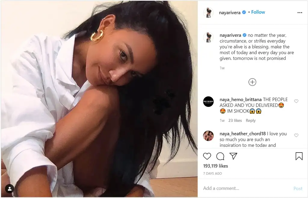 Được biết, vài ngày trước khi mất tích, Naya đã đăng một tấm ảnh kèm dòng trạng thái vô cùng bí ẩn trên Instagram.