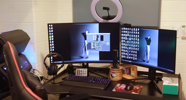 Anh còn kết hợp dàn công suất trên với 2 màn hình MSI Optix MAG322CQRV cùng combo Razer gồm bàn phím Razer Huntsman Elite, chuột Razer Mamba Wireless và lót chuột Razer Goliathus vô cùng hầm hố cùng ghế gaming MSI MAG-CH120. Đặc biệt, ViruSs sở hữu màn hình Acer Predator X34A siêu to khổng lồ. Như vậy, góc gaming của chàng streamer giá trị hơn 155 triệu đồng.