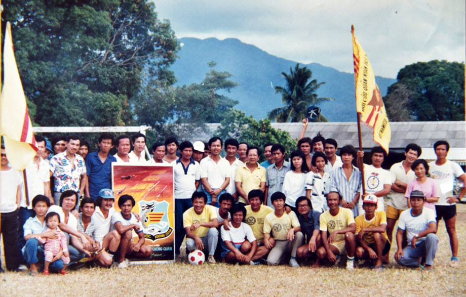 Phi công Lê Hưng (hàng đứng, thứ ba, từ trái) đến thăm và ủy lạo các thuyền nhân Việt Nam trong trại tị nạn Bataan, Philippines, khi ông đang phục vụ tại căn cứ Subic Bay, Philippines năm 1984. (Hình: Văn Lan/Người Việt chụp lại)