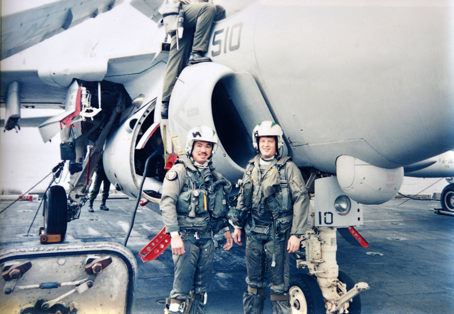 Phi công Lê Hưng (trái) và chuyên viên kỹ thuật điện tử bên oanh tạc cơ A-6E, bay trong mọi thời tiết, trên hàng không mẫu hạm USS Nimitz. (Hình: Văn Lan/Người Việt chụp lại)