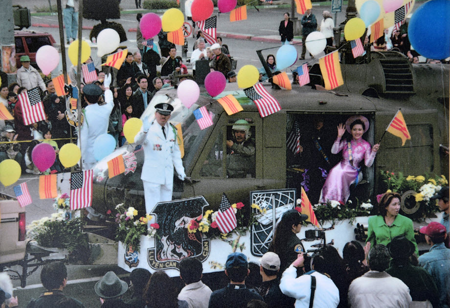 Trung Tá Phi Công Hải Quân Hoa Kỳ Lê Hưng trong diễn hành Tết 2003 tại Little Saigon. (Hình: Văn Lan/Người Việt chụp lại)