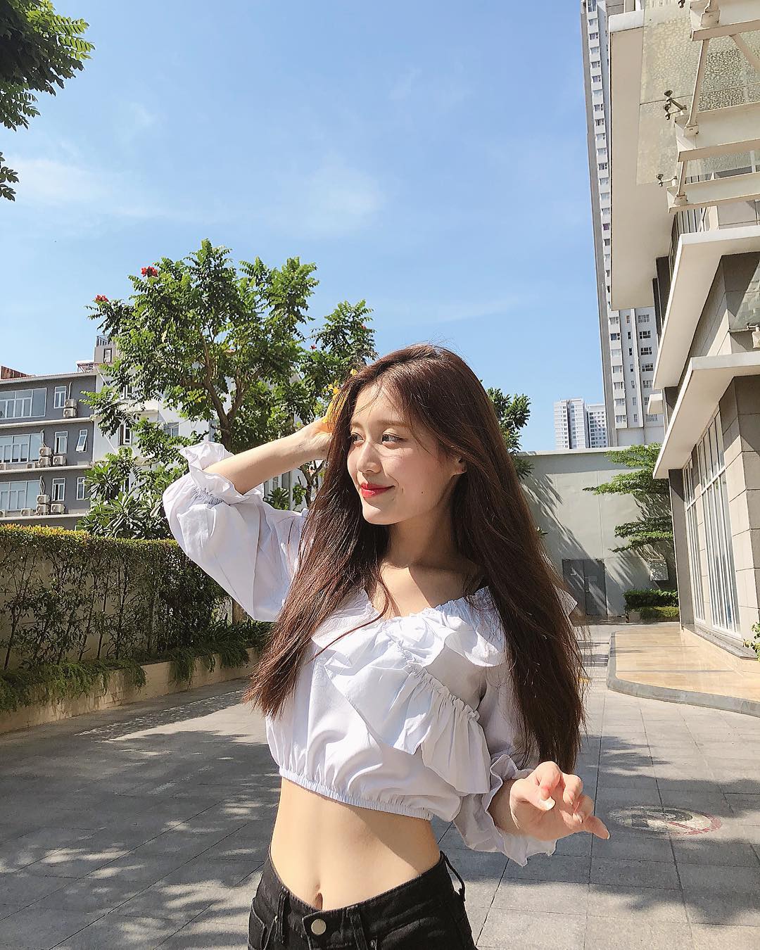 Vòng eo nhỏ là điểm giúp cô tự tin diện những item khoe vòng 2 như áo croptop.