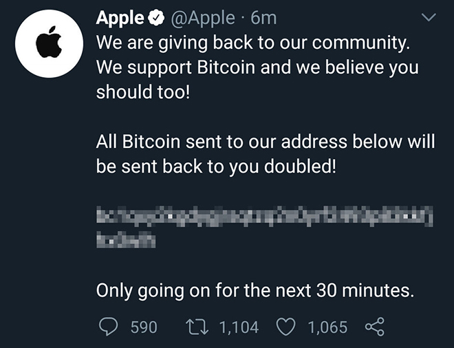 Các tin tặc - giả danh là Apple đã đăng tải trạng thái có nội dung: "Tất cả Bitcoin được gửi đến địa chỉ của chúng tôi dưới đây sẽ được gửi trả lại gấp đôi!" Tweet được gửi từ tài khoản của Apple đã bị xóa ngay sau khi đăng, có lẽ là do công ty đã lấy lại quyền truy cập vào tài khoản nhưng nhiều người đã kịp chụp lại.