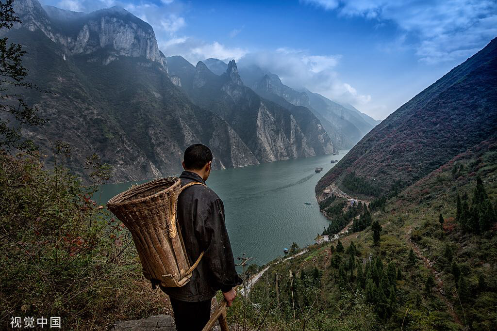 Người đàn ông đứng trên núi nhìn xuống dòng sông Dương Tử ở huyện Wuxia, thành phố Trùng Khánh, Trung Quốc.