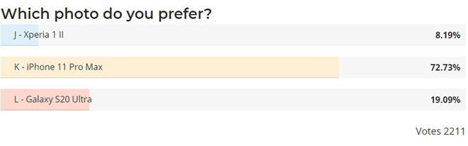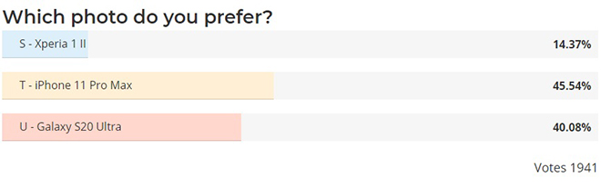 Do đó, trang tin công nghệ Phone Arena đã tiến hành kiểm tra camera giữa Sony Xperia 1 II, Samsung Galaxy S20 Ultra và iPhone 11 Pro Max thông qua bài kiểm tra ảnh “mù” – người xem không biết hình ảnh nào được chụp bởi thiết bị nào. Các tiếp cận này có phần khách quan hơn với người dùng, giúp họ dễ dàng tìm ra những chiếc điện thoại chụp ảnh tốt nhất của năm.
