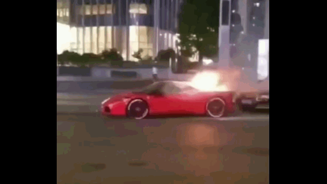 Một chiếc siêu xe Ferrari 458 Italia màu đỏ đang dừng đỗ bên đường đã bất ngờ bốc cháy một cách dữ dội.