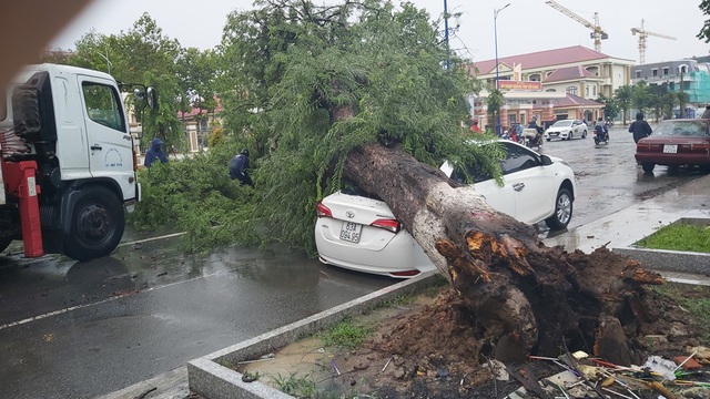 Sau đó khoảng 10 phút, trời bắt đầu mưa lớn kèm theo giông gió. Lúc này, cây me có đường kính và tán cây khá lớn bất ngờ bật gốc đè lên phần đuôi xe 4 chỗ.