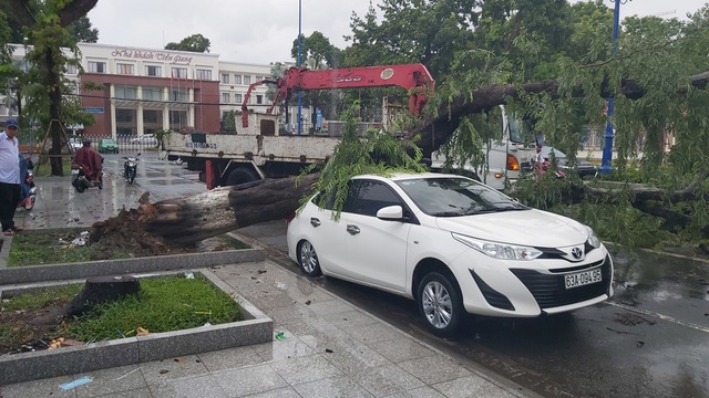 Chiều qua 24/7, tại Tiền Giang xảy ra một cơn giông lốc lớn khiến một cây me ngay trước bệnh viện Đa khoa Trung tâm Tiền Giang bị bật gốc, đè lên ô tô 4 chỗ đang đậu tại khu vực này.