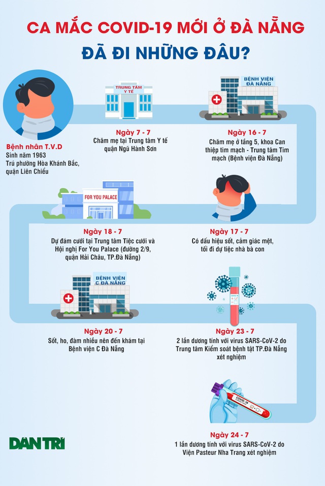 Trước đó ngày 18/7, bệnh nhân có triệu chứng mệt mỏi, sốt nhẹ. Đến ngày 20/7, bệnh nhân đi khám và nhập viện điều trị tại Bệnh viện C Đà Nẵng với chẩn đoán viêm phổi. Ngày 21-22/7, bệnh nhân diễn biến nặng hơn, ho khạc đờm, sốt cao liên tục, vẻ mặt nhiễm trùng nhiễm độc, suy hô hấp…