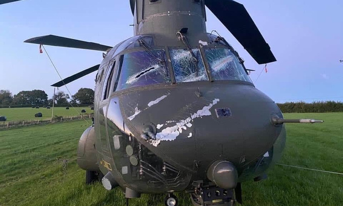 Hình ảnh được chia sẻ trên mạng xã hội Anh hôm 30/7 cho thấy một trực thăng vận tải CH-47 Chinook bị hư hỏng. Phi cơ hạ cánh khẩn cấp xuống cánh đồng ở Llangynin, vùng Carmarthenshire, xứ Wales khi đang làm nhiệm vụ huấn luyện bay thấp thông thường gần căn cứ Odiham trước đó hai ngày.
