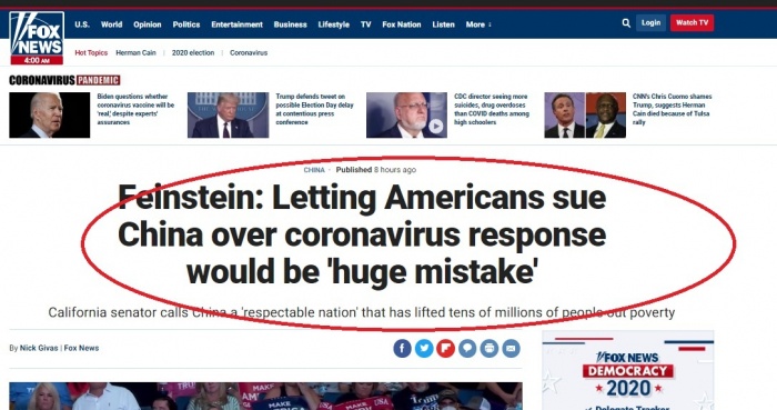Báo Fox News của Hoa Kỳ ngày 30/7 (theo giờ Mỹ) đã đăng tải một bài viết có tiêu đề “Dianne Feinstein: Để người Mỹ kiện Trung Quốc về đại dịch virus Corona sẽ là một sai lầm lớn”.