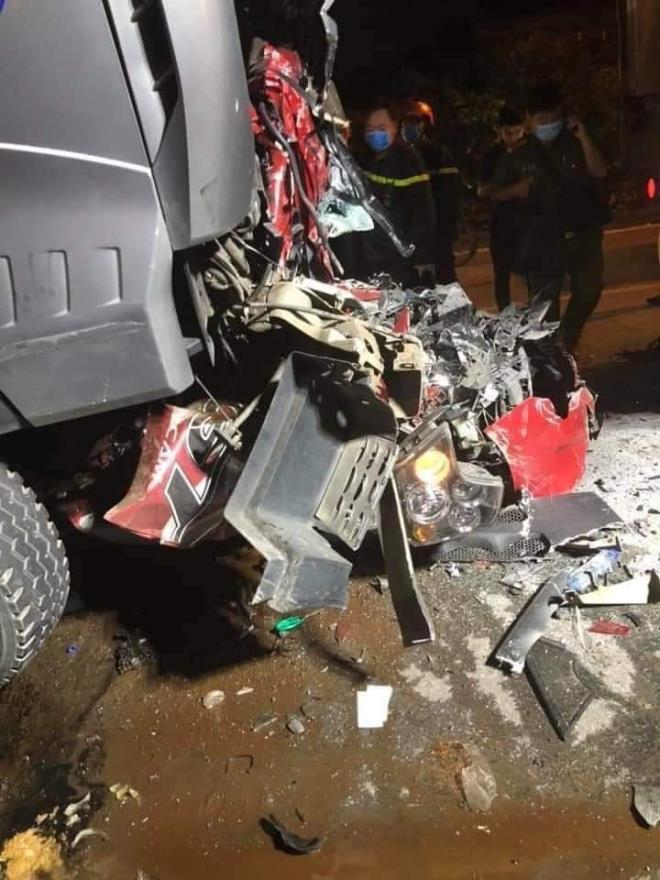 Tại hiện trường, chiếc xe ô tô con bị biến dạng hoàn toàn. Phía trước là một chiếc xe tải đang dừng đỗ. Bánh xe container chèn đúng vào vị trí trung tâm chiếc xe nên không nhìn thấy biển kiểm soát.