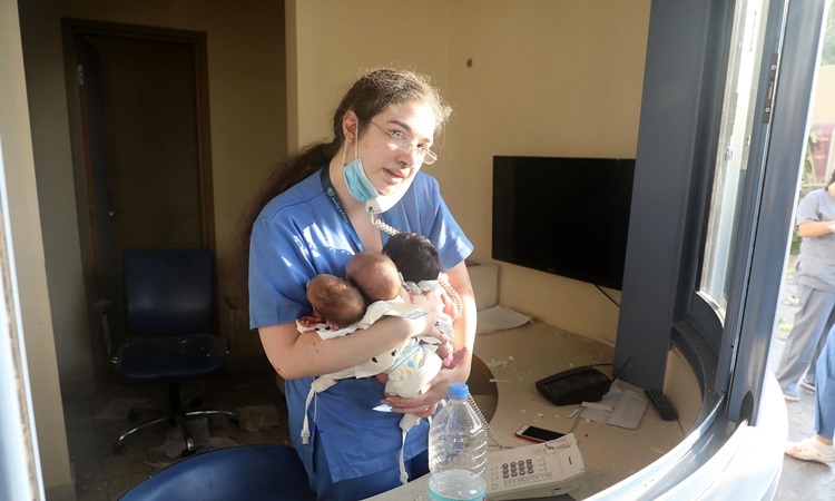 Nữ y tá dũng cảm xông vào ôm được ba em bé sơ sinh ra khỏi đống đổ nát của bệnh viện Al Roum, nơi chịu thiệt hại nặng nề do vụ nổ ở cảng Beirut.