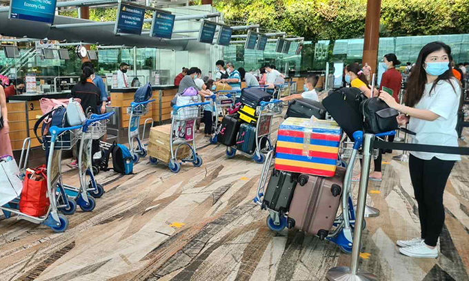 Hành khách chờ làm thủ tục lên chuyến bay từ Singapore về nước, ngày 7/8. Ảnh: Bộ Ngoại giao.