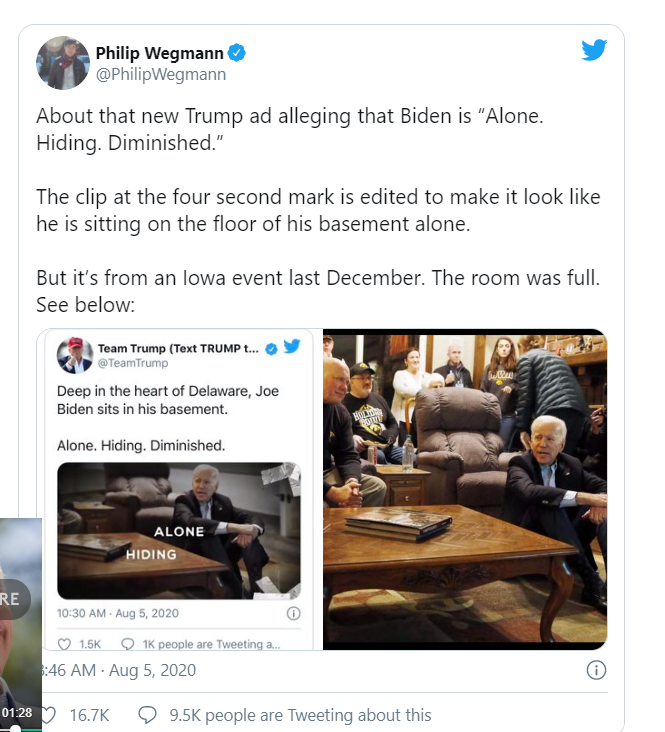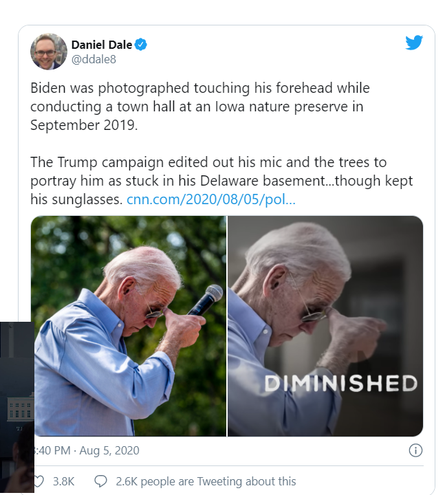 Another image was of Biden at an outdoor event, in sunglasses and with a mic in hand. The original shows him pause to scratch his head or adjust the sunglasses, but the Trump campaign altered it to remove the mic and place him in a “basement.”