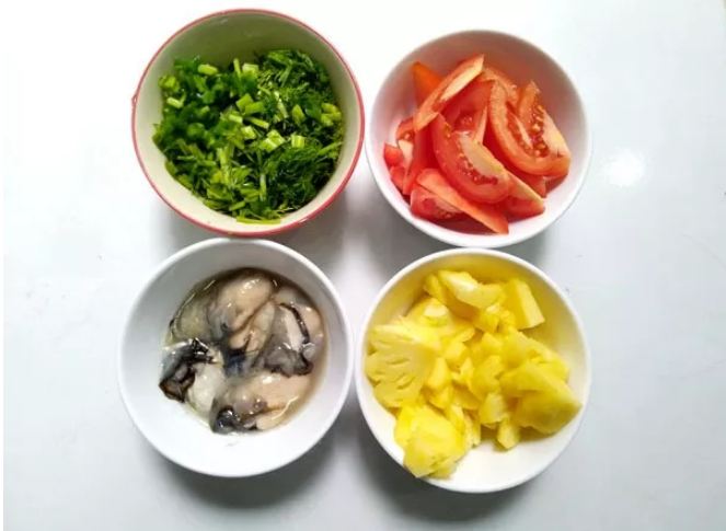 Hàu tách bỏ vỏ lấy phần nhân thịt cho vào bát. Dứa thái lát; cà chua rửa sạch thái múi cau; hành lá và rau thì là thái nhỏ; hành khô băm nhỏ.