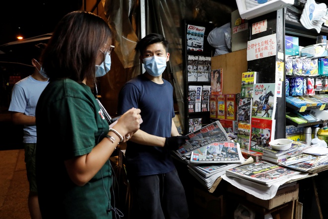 Người dân Hong Kong xếp hàng từ sáng sớm để mua báo Apple Daily, tờ báo có chủ là ông trùm truyền thông Jimmy Lai vừa bị bắt theo luật an ninh mới. Ảnh: Reuters.