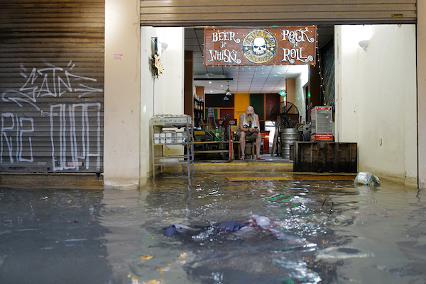 Rác ở điểm tập kết trên phố Đinh Liệt bị cuốn vào dòng nước, trôi nổi khắp nơi, tràn vào các cửa hàng.