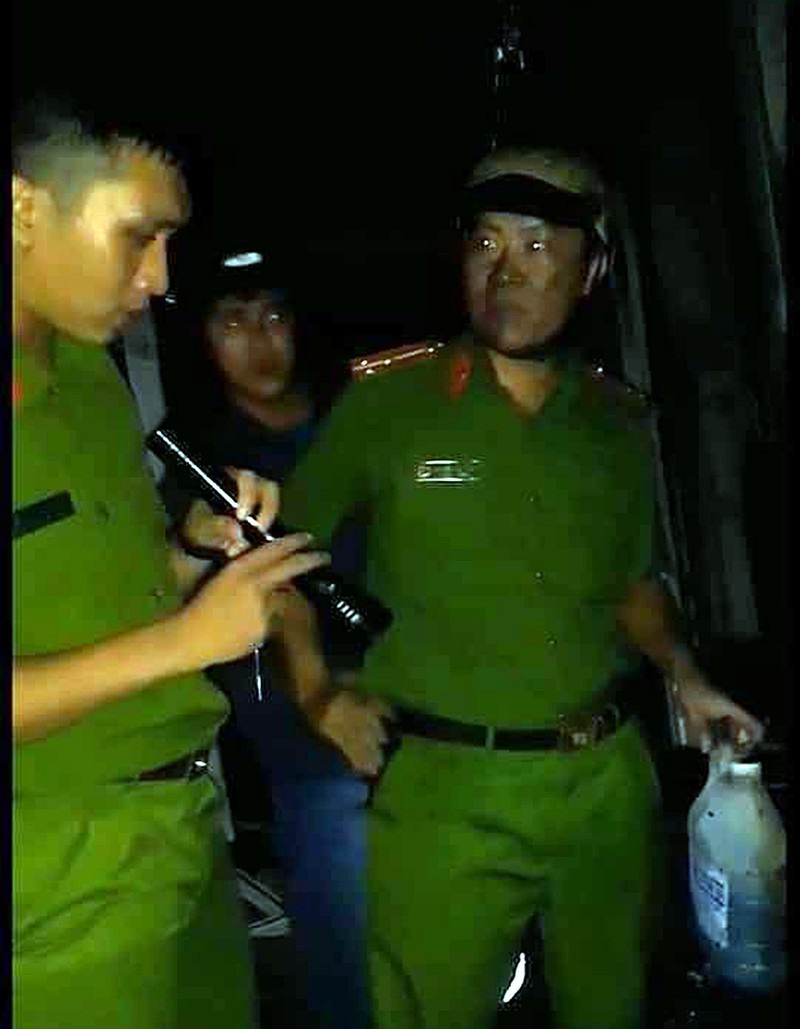 Thượng úy Hùng thu giữ can xăng. Ảnh PLO