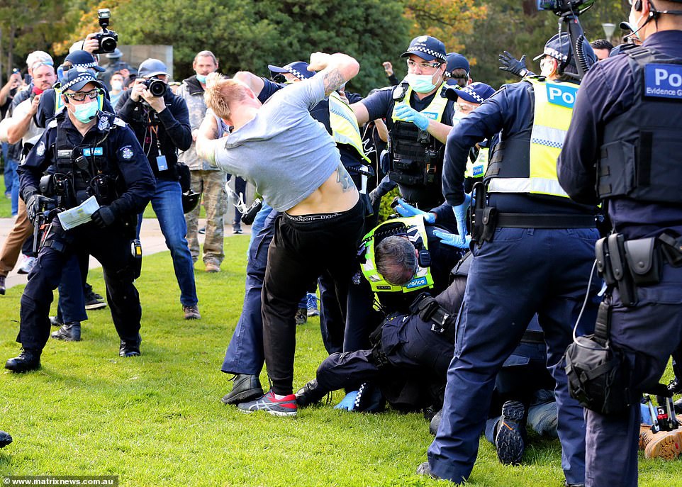 Cuộc biểu tình nhanh chóng trở thành cuộc đụng độ giữa người dân và cảnh sát. Video ghi lại cảnh tượng nhiều người biểu tình không đeo khẩu trang đang vật lộn với lực lượng hành pháp, trong khi nhiều tuyến đường ở khu trung tâm Melbourne bị phong tỏa. Ảnh: AAP.