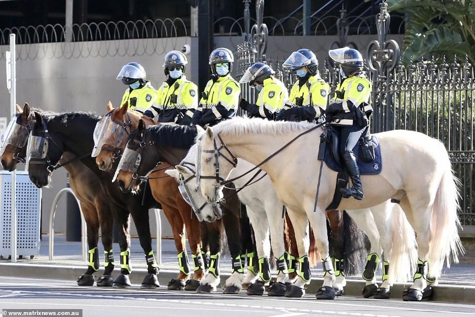 Lực lượng chức năng phải huy động cả kỵ binh và cảnh sát chống bạo động để trấn áp người biểu tình ở Melbourne. Ảnh: Matrix News.