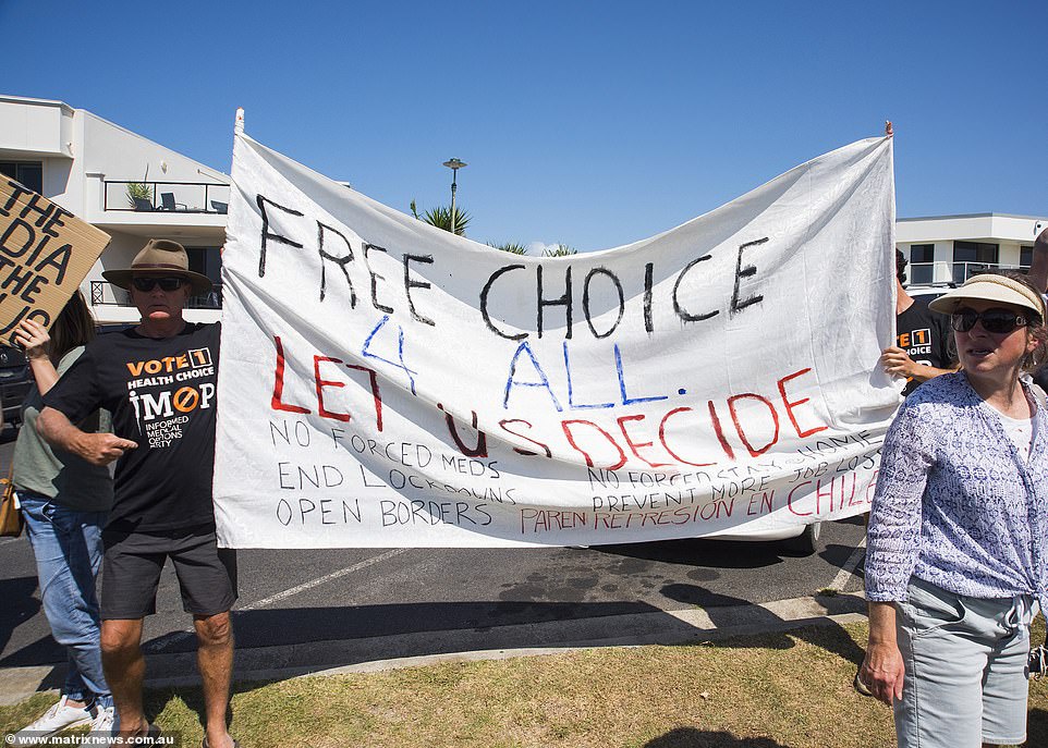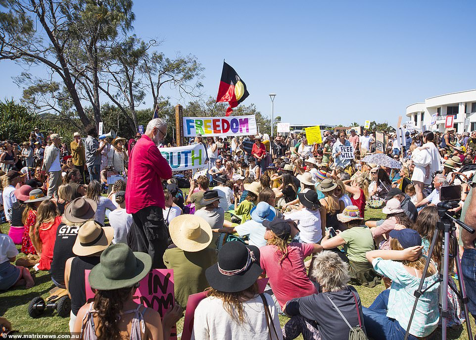 Các cuộc biểu tình cũng đã nổ ra ngoài tầm kiểm soát ở Vịnh Byron, phía bắc bang New South Wales. Người biểu tình giơ cao biểu ngữ "Tự do". Một số khác mang thông điệp: "Hãy để chúng tôi quyết định". Ảnh: Matrix News.
