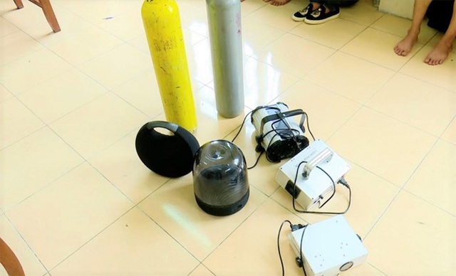 Tang vật thu giữ gồm 2 đĩa sứ, 2 túi nilon, 1 tờ tiền mệnh giá 10.000đ cuộn tròn hình ống hút; 24 quả bóng cười và 2 bình khí Nitơ, 1 bộ đèn chớp, 1 loa phát nhạc.