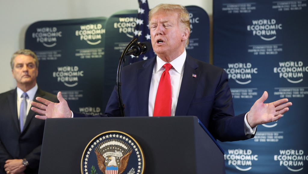 Tổng thống Mỹ Donald Trump xuất hiện trong một cuộc họp báo tại Diễn đàn Kinh tế Thế giới (WEF) lần thứ 50 ở Davos, Thụy Sĩ ngày 22/1 với ông Roberto Azevedo ở phía sau. Ảnh: Reuters.