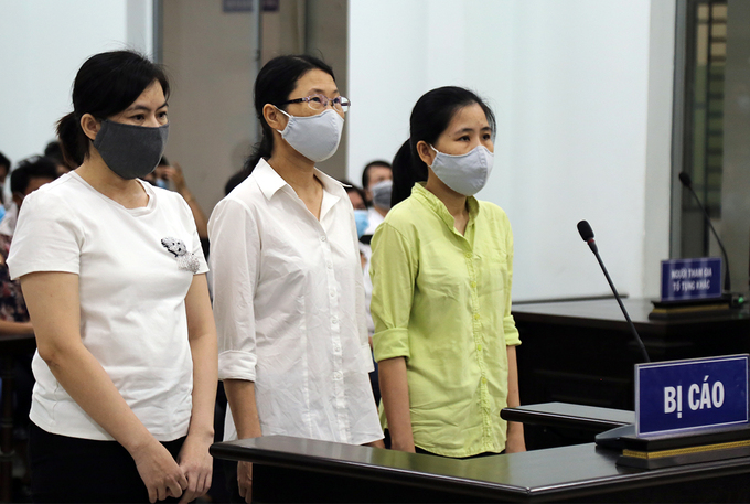 Bị cáo Linh (bên trái), Hằng và Uyên tại phiên tòa chiều 16/9. Ảnh: Xuân Ngọc.