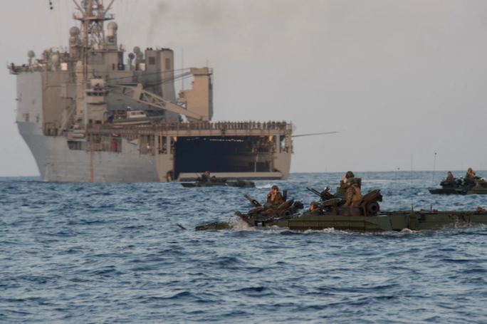Thủy quân lục chiến Mỹ cơ động gần tàu đổ bộ Whidbey Island, USS Germantown. Ảnh: Breaking Defense