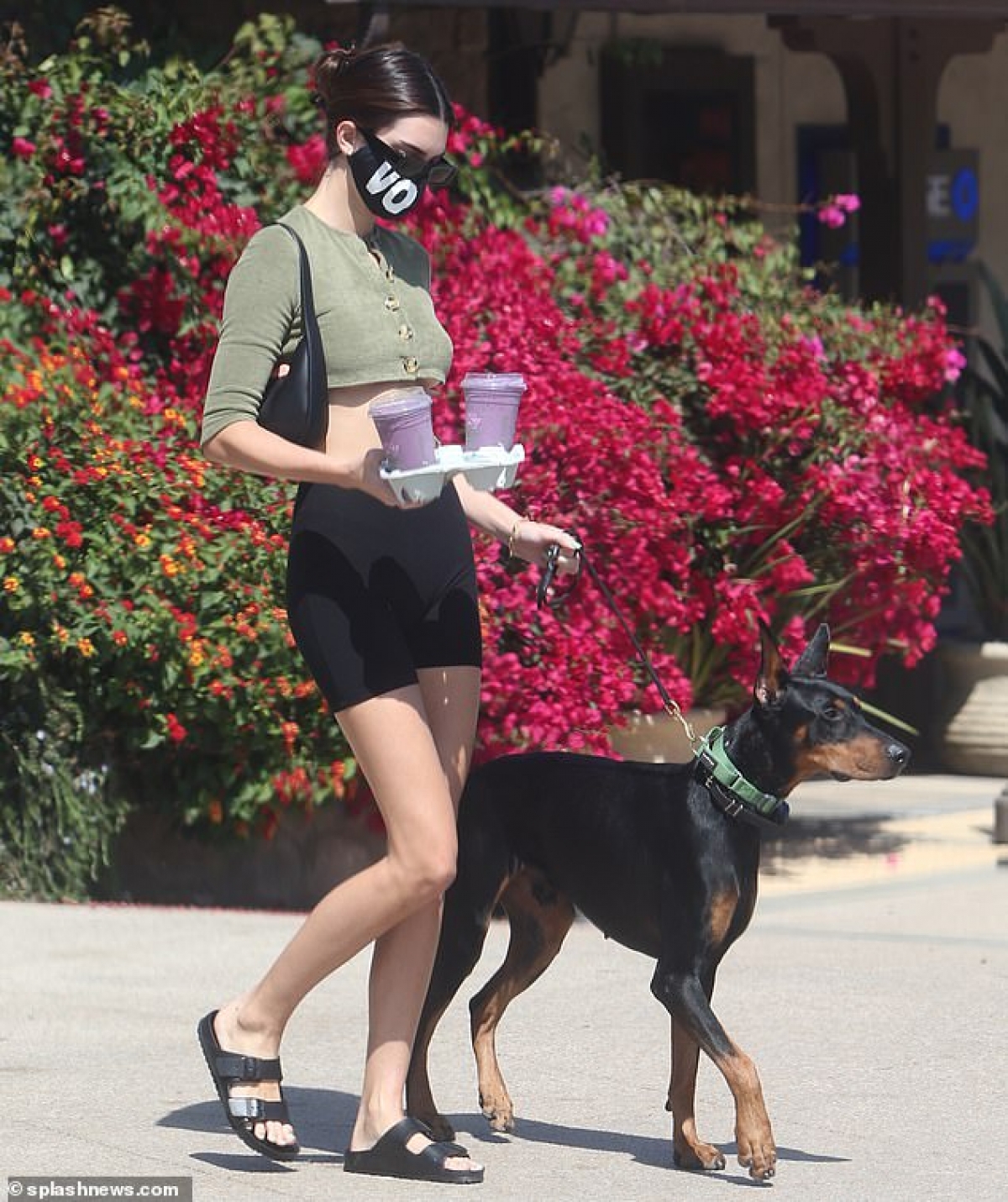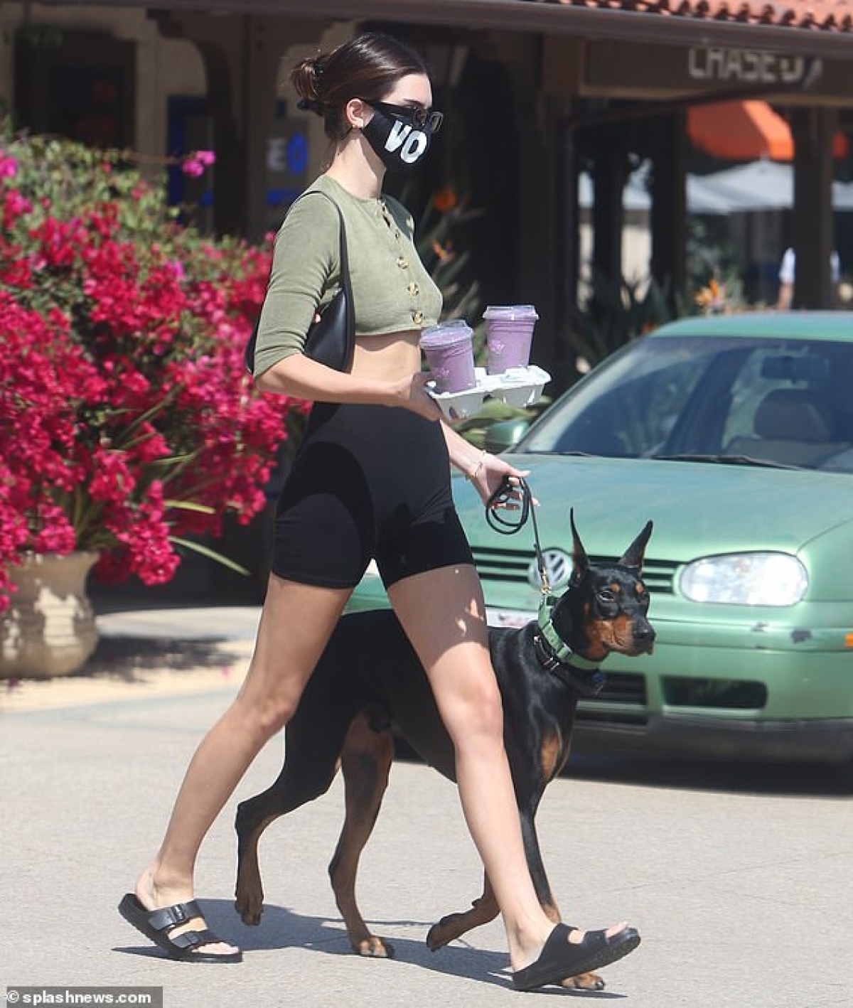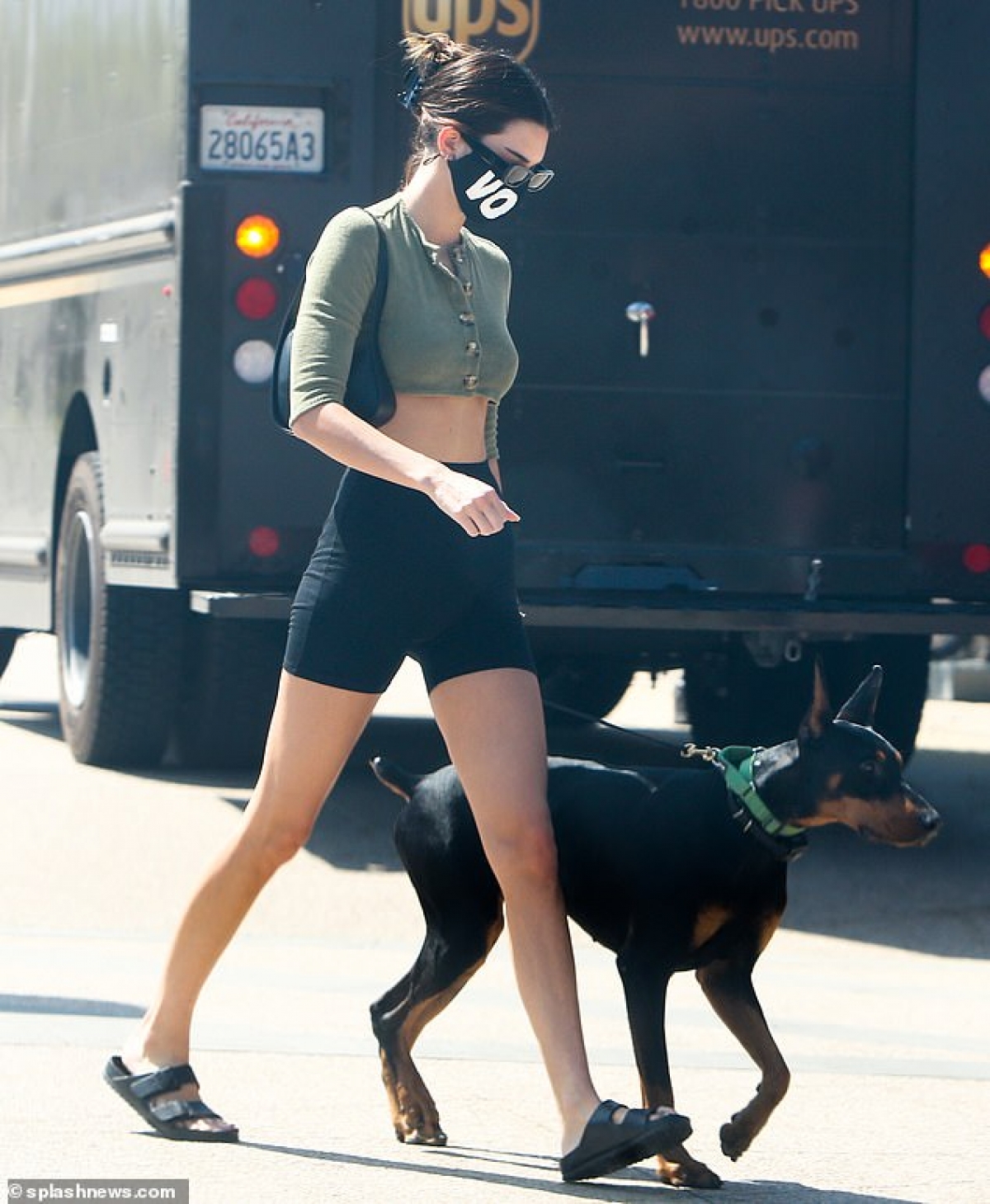 Kendall Jenner mặc croptop phô hình thể nóng bỏng dắt cún cưng đi dạo phố. Cô cũng đeo khẩu trang cẩn thận, mặc croptop và quần thun ôm sát, phô hình thể nóng bỏng dắt cún cưng đi dạo phố ở Malibu hôm 23/9.